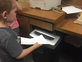 The kids went with Steven one night to the church so he could write out some checks and they were fascinated by the shredder... Of course not fully understanding, Caden drew a picture, shredded it, then promptly wanted it back.